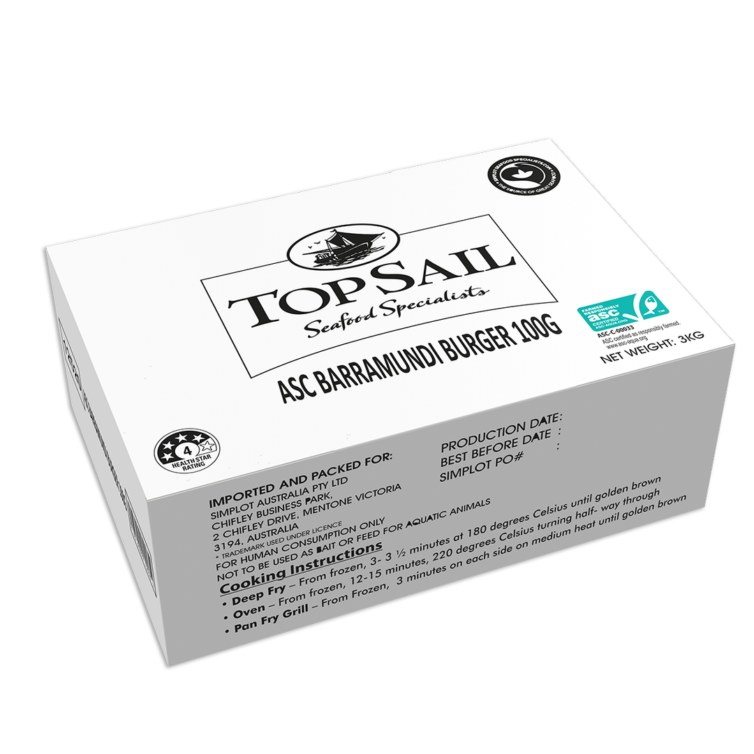 Hand-made, natural, and delicious, our uncoated Top Sail Barramundi Burger is made with sustainably sourced ASC Barramundi and natural herbs. Recognised for its excellence in sustainability and taste, our burger proudly won the ASC "Best Responsible New Seafood Product” Award Australia 2024. Perfect for pubs, clubs, caterers, and takeaway shops alike, this burger is tailored to meet the demands of operators who value exceptional taste and quality.