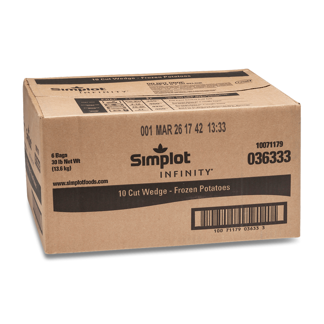 Nuestras papas a la francesa Infinity® están elaboradas de manera exclusiva para operaciones rápidas y de gran volumen, así como para escuelas que necesitan una opción de fritura rápida. Horneadas o fritas, su cobertura transparente extiende el tiempo de conservación y su largo de primera calidad ofrece una cobertura del plato increíble y porciones adicionales por caja. Esta cuña de 10 cortes con cáscara conserva la temperatura y crocancia en la cafetería o en cajas de delicatessen.